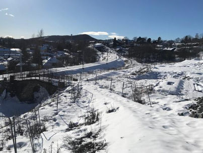 Bilde av den gamle jernbanetraseen, mot "Perlen", og på Landås feltet.